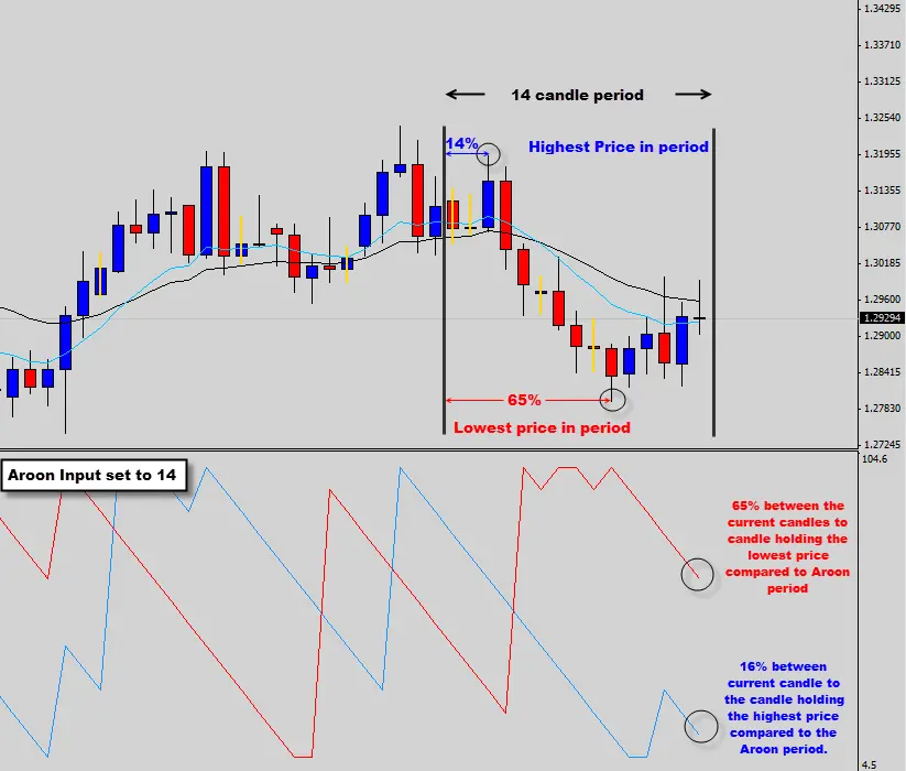 Aroon up is the amount of time (on a percentage basis) that is remaining of the overall period after the distance between the current candle and the highest price has been considered. Aroon down is calculated in just the opposite manner, compared current price to the lowest price within the set time period.