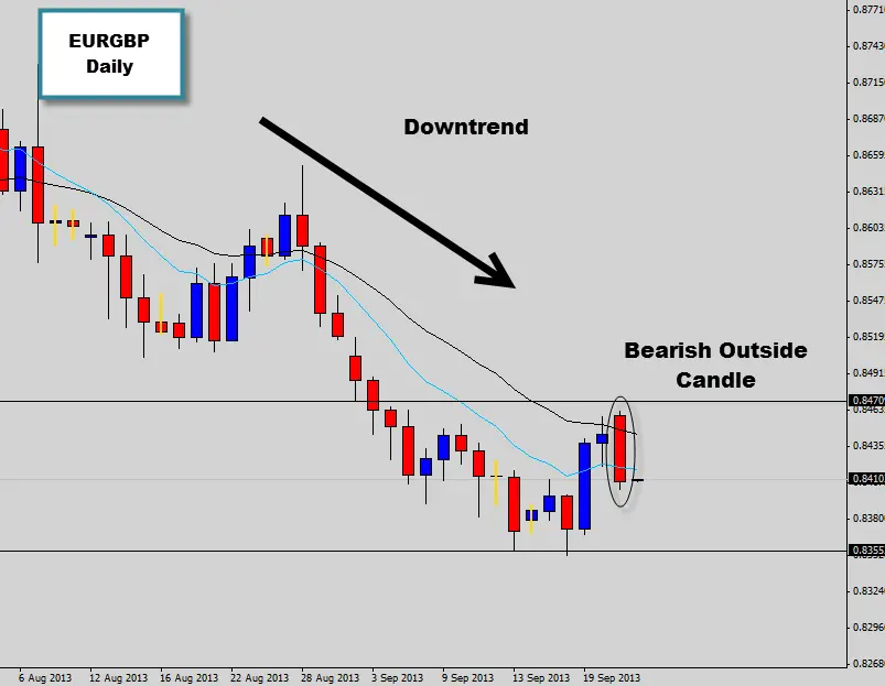 Notice on the chart above how the market opened much higher than the previous candle close. This gapping up action made price open right at a daily resistance level on the EURGBP, which was instantly rejected by the bears. The bearish rejection continued all session and the candle closed as an Outside Candle.