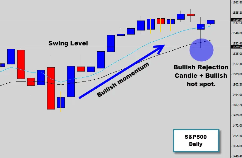 Looking at one of the popular indexes today, the US S&P500, we’ve spotted a large and obvious price action signal that has formed at the close of the last new york session. This Bullish rejection price action shows up that the market ‘rejected’ sell offs into a swing level in this market, and for those who know the Price Action Protocol, this is a market hot spot for bullish PA.
