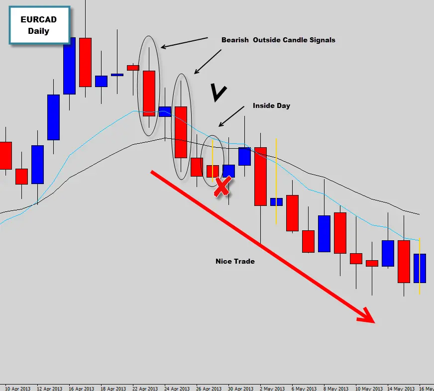 In the previous discussion on the EURCAD daily chart we were talking about a bearish Outside Day signal that was triggered after a bullish indecision candle setup failed. Generally signals that fail often create outside candle signals in the opposite direction