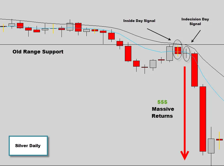 This is just a classic example how you don’t need indicators to catch massive moves in the market, indicators lag and would have probably signaled you into this move half way down the move, no good. For information on trading price action setups like the inside day and indecision candle check our Price Action War Room.