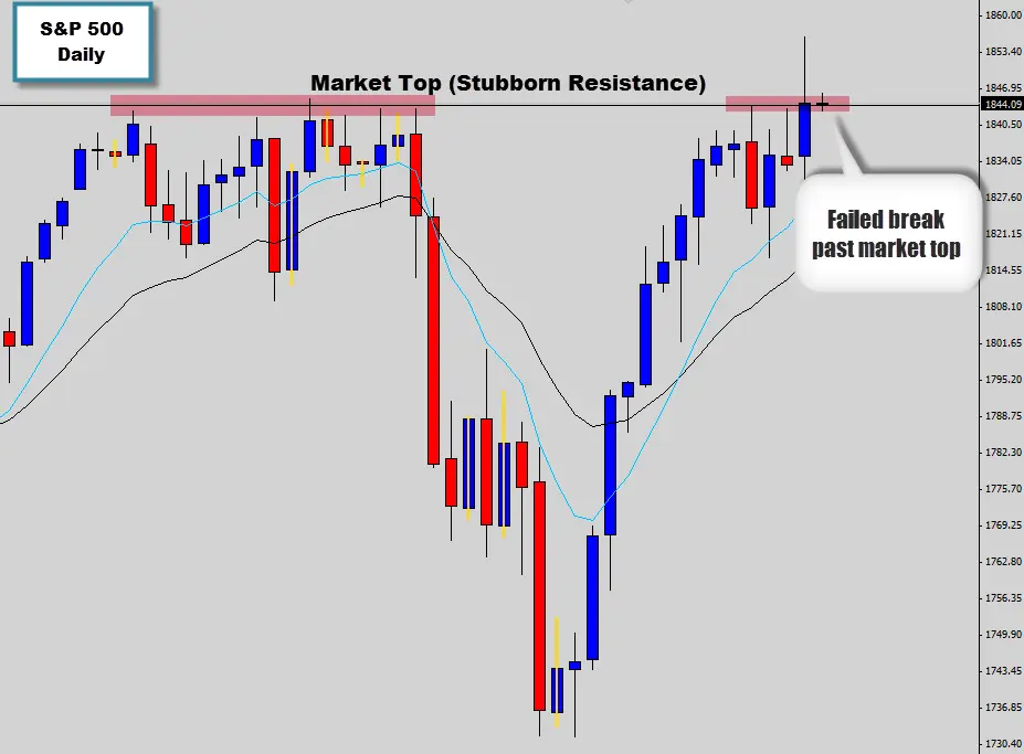 We’ve been waiting the S&P closely lately as a market ceiling as formed at all time highs. This level has been very stubborn with continuously attempts to push past it by the buyers have failed. Last session a breakout to the high side did actually occur but it was short lived.