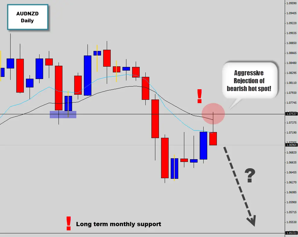 The AUDNZD has been getting a lot attention of us price action traders the last few months dropping some really nice clear cut signals in the monster downtrend which developed. Recently the market has bounced of a strong long term monthly support level, dropped a large bearish rejection candle and is now heading back down looking to retest those important monthly lows.