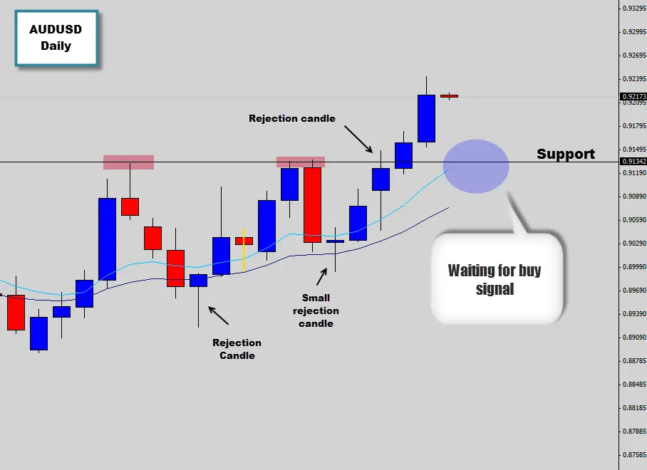 On the AUDUSD daily chart you can see the market has just fired up higher off the back of a bullish rejection candle with a strong close to the body. Now the market has breached a key containment level and floating at new highs, we are waiting for pullbacks into the mean value for buying opportunities.